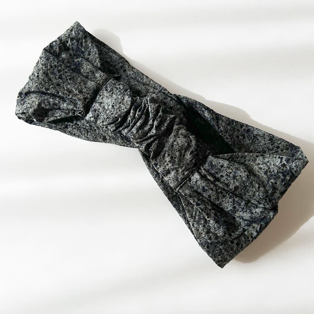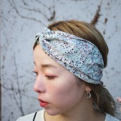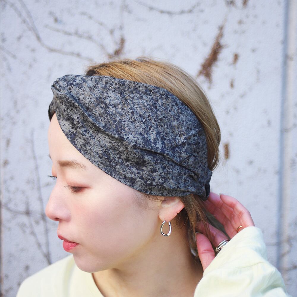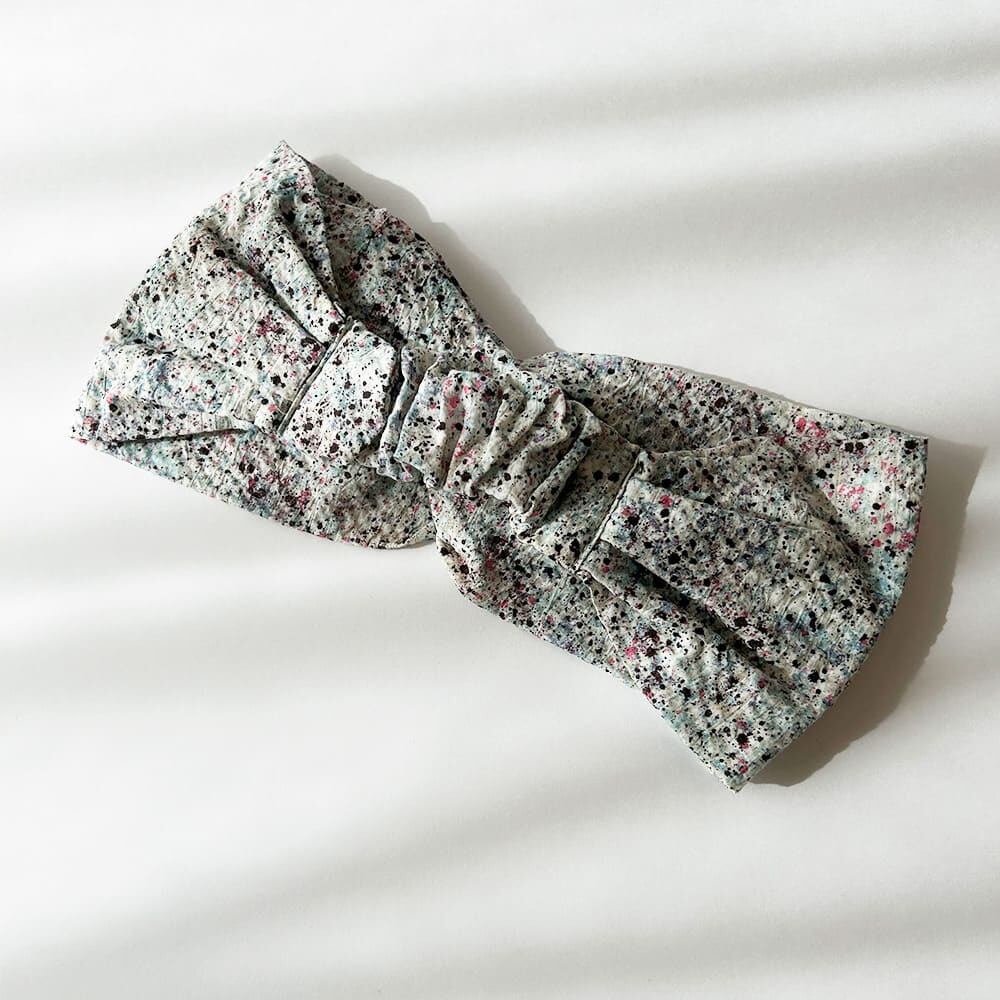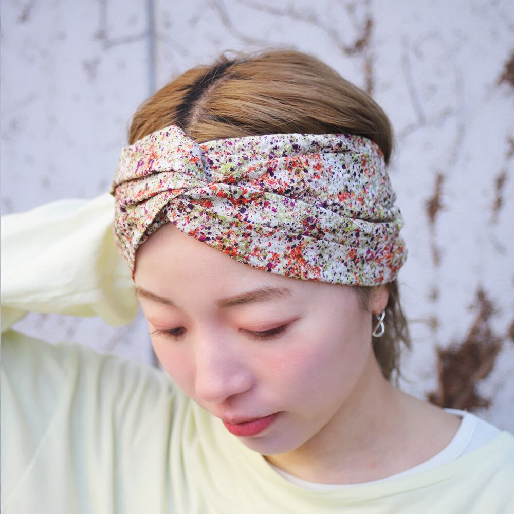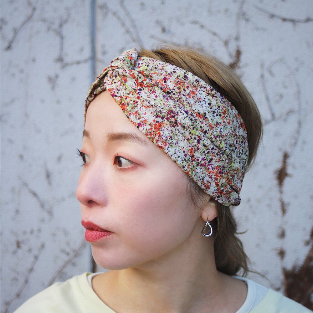 手描きの現代風の抽象柄で、「ポロッケスク」という絵画技法を使った上品な総柄の繰り返し模様が色鮮やかなヘアバンドです。