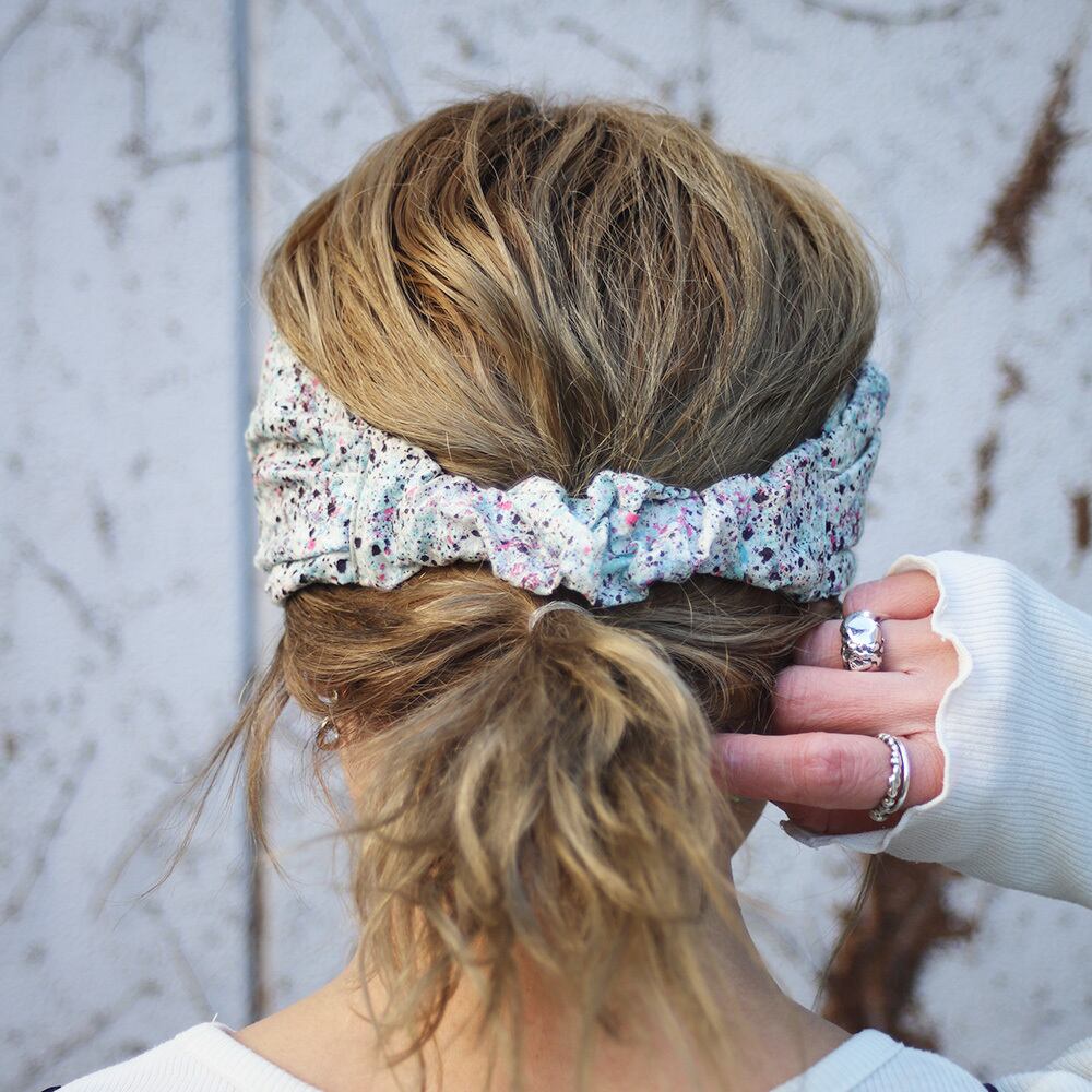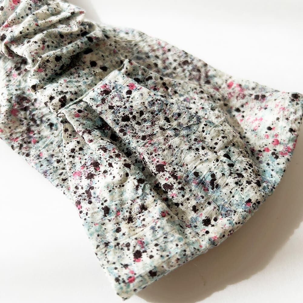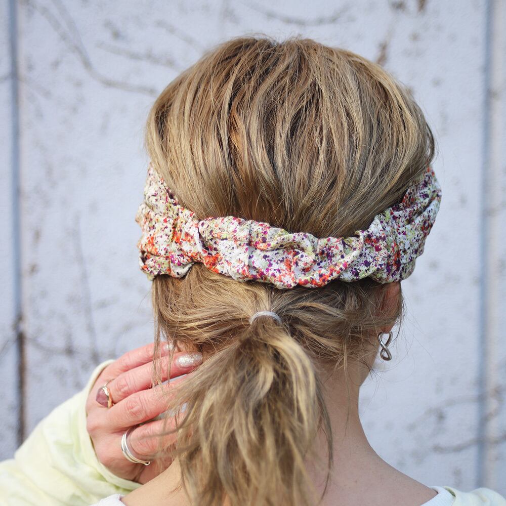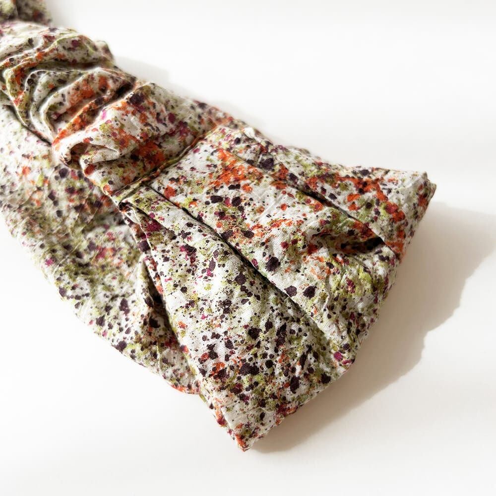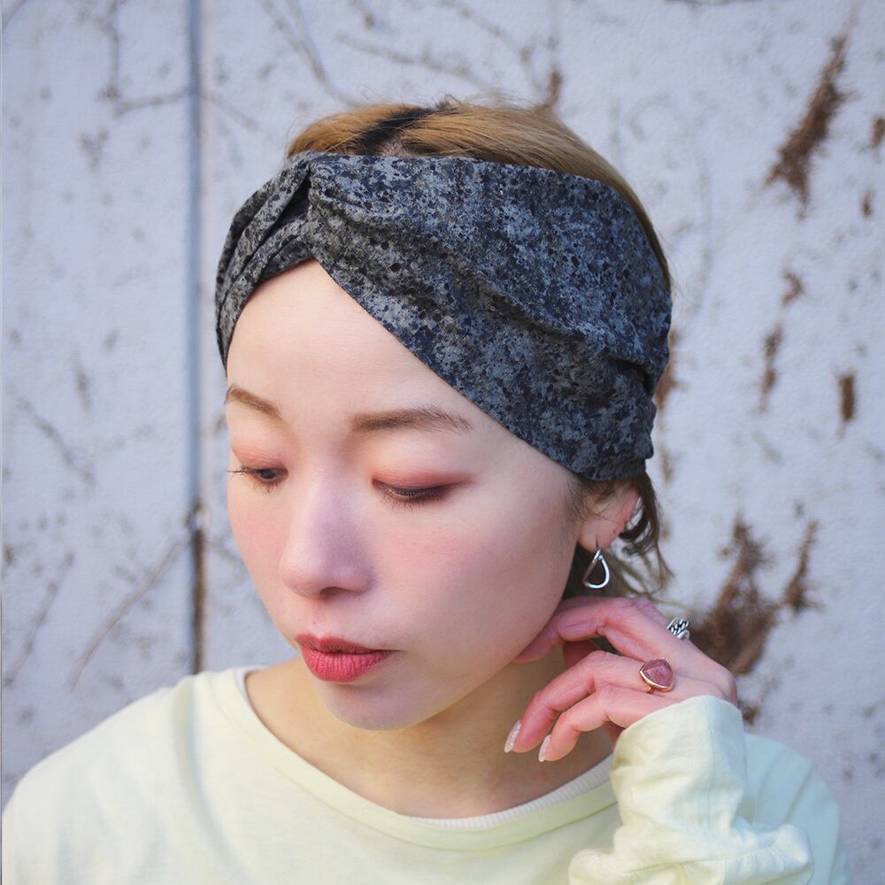 手描きの現代風の抽象柄で、「ポロッケスク」という絵画技法を使った上品な総柄の繰り返し模様が色鮮やかなヘアバンドです。