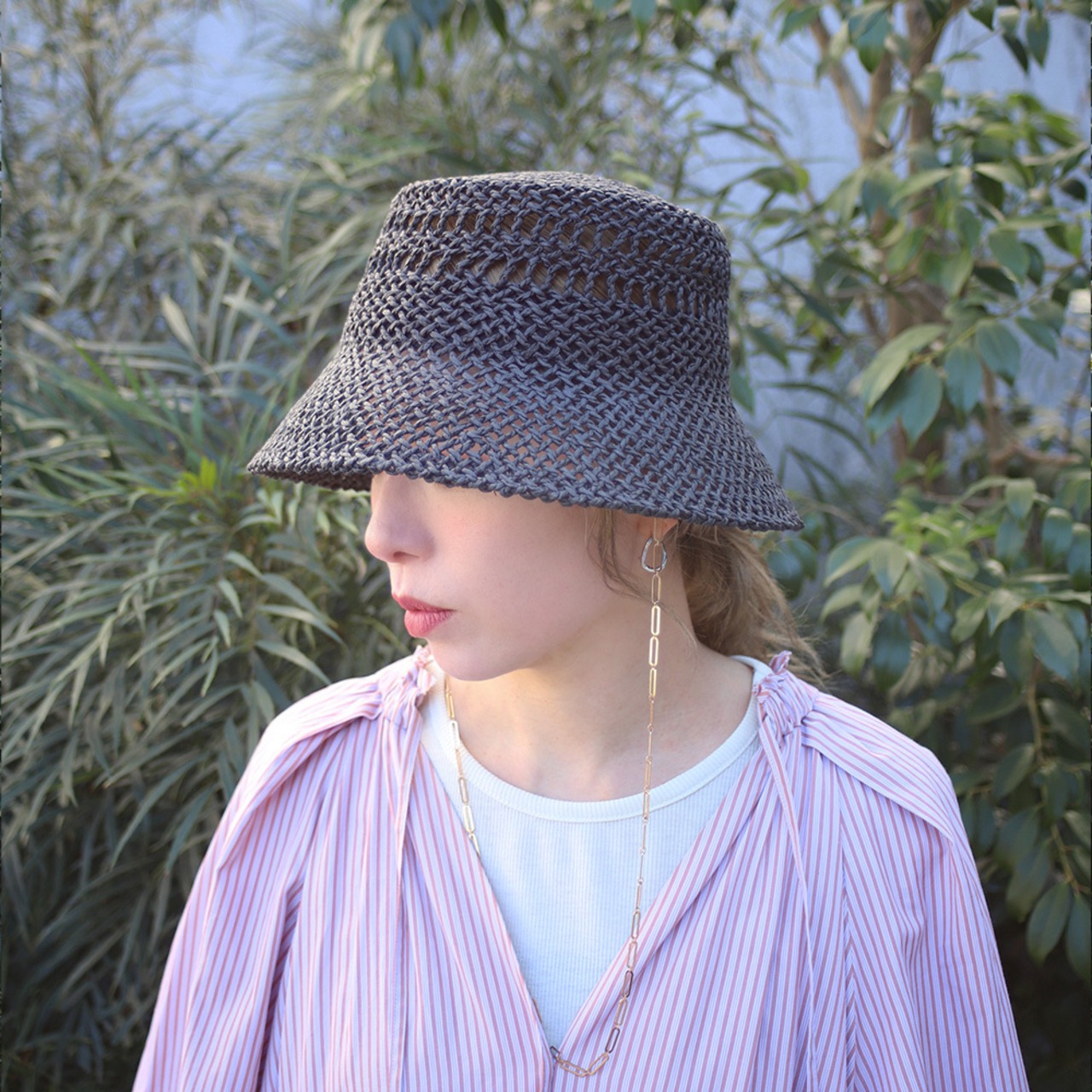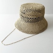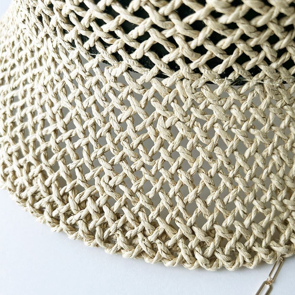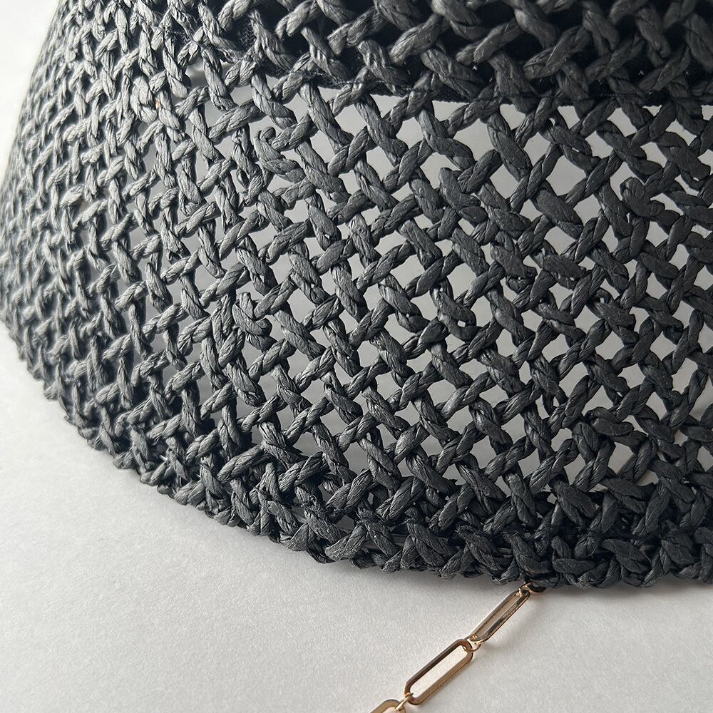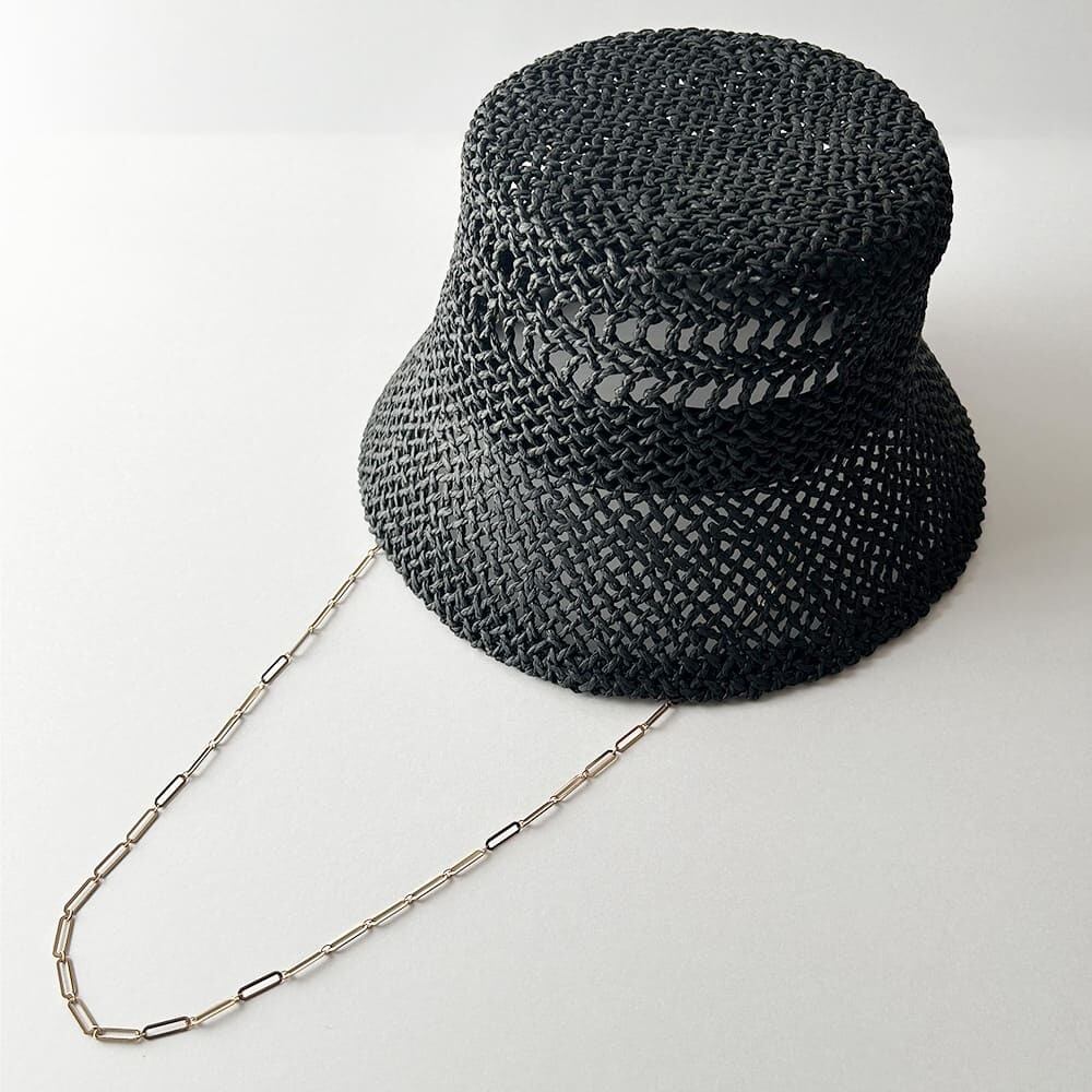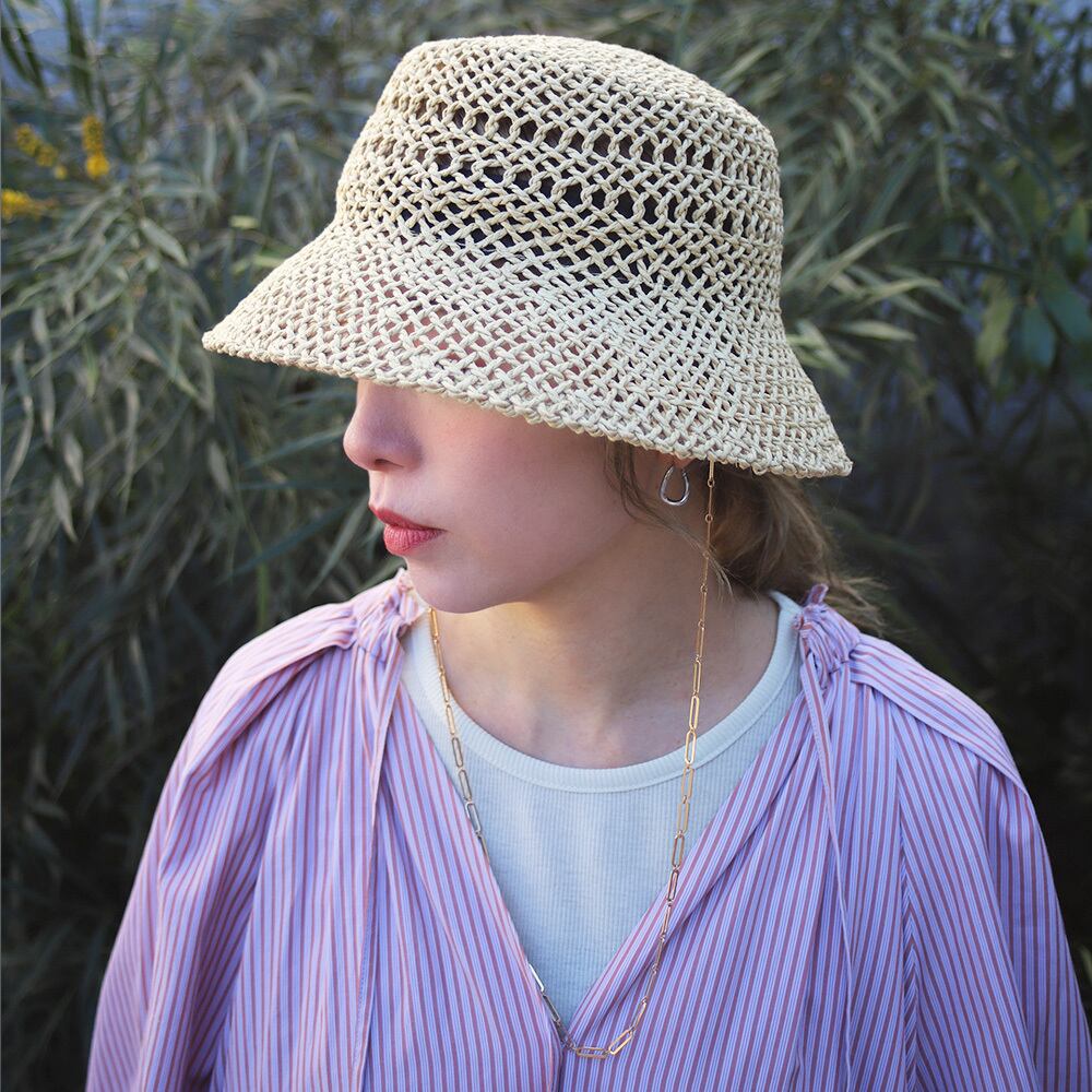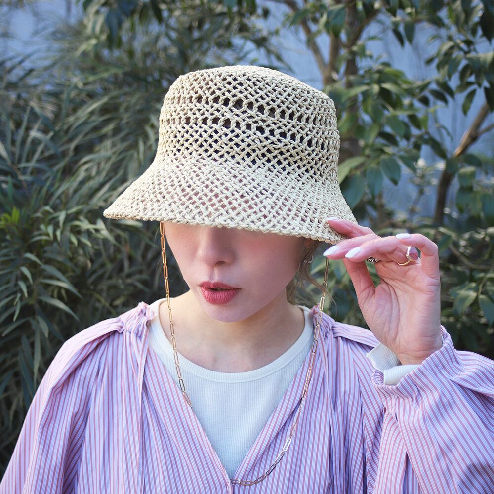 透かし柄の入った涼しげな見た目と、耳元から垂れるゴールドチェーンのアクセントがマッチしたペーパーハットです。
