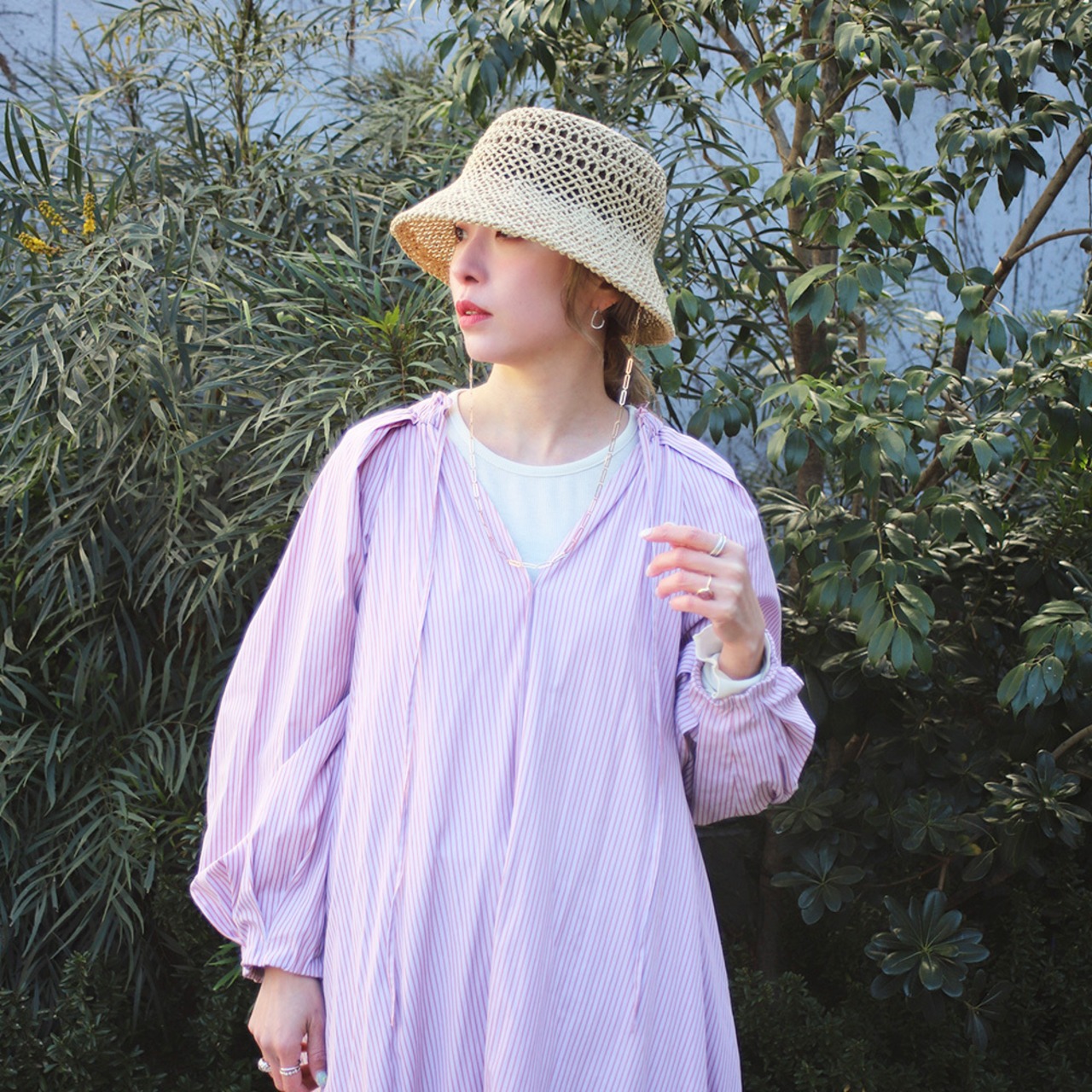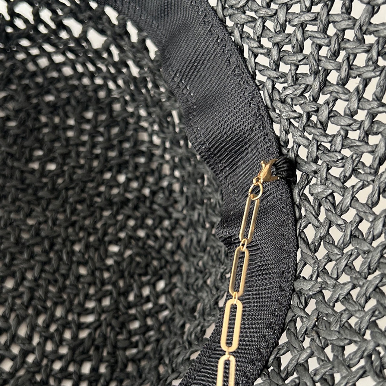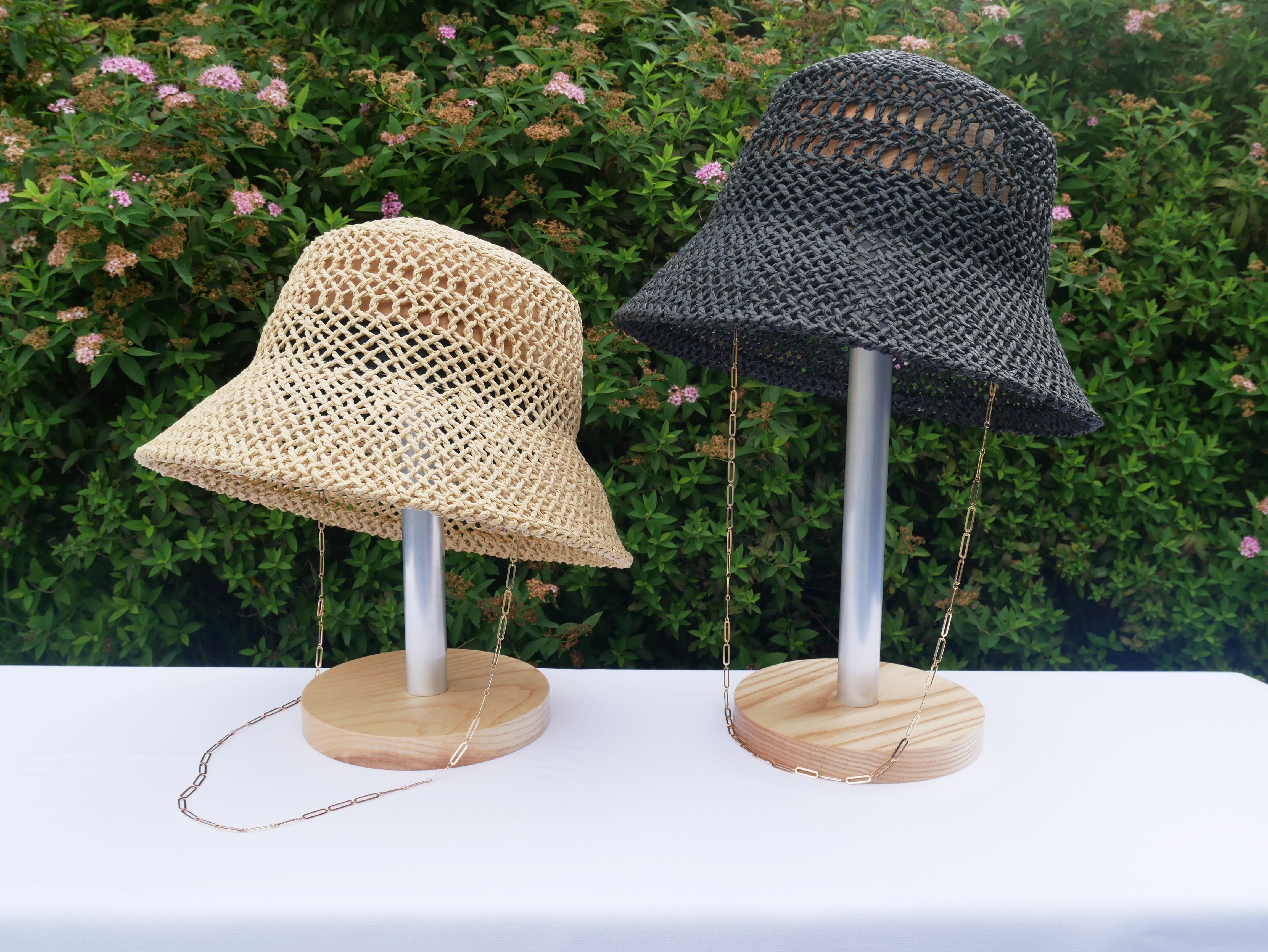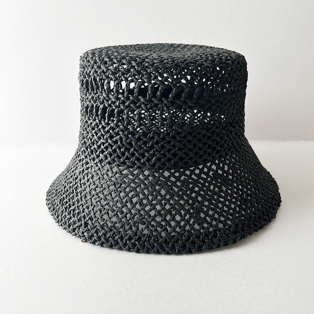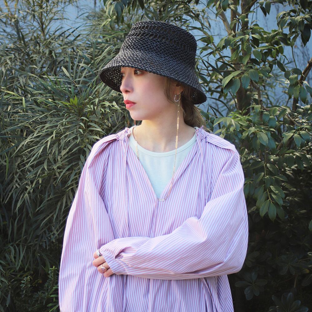 透かし柄の入った涼しげな見た目と、耳元から垂れるゴールドチェーンのアクセントがマッチしたペーパーハットです。